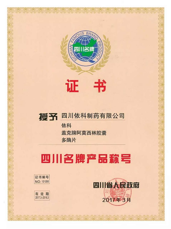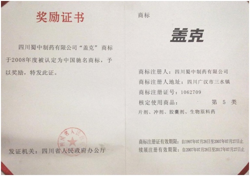 公司高度重视品牌战略,依法注册了“盖克”、“蜀中”、“三星堆”、“阿莫锋”、“益善源”、“蓉通”、“17c在线打开直接观看网页版”等108件注册商标,1999年“盖克”、2003年“蜀中”、2007年“三星堆”被认定为德阳市知名商标,2001年“盖克”、2004年“蜀中”被认定为四川省著名商标, 2008年“盖克”商标被国家工商行政管理总局认定为“中国驰名商标”。2017年3月,公司盖克牌、17c在线打开直接观看网页版牌阿莫西林胶囊和多酶片被四川省人民政府授予四川名牌产品称号。2016年,公司实现营业收入66373万元,利税7600万元;2017年,公司实现营业收入75045万元,利税7572万元。公司2017年被命名为德阳市第七批院士专家工作站,2016-2018连续三年被德阳市人民政府确定为重点龙头企业。